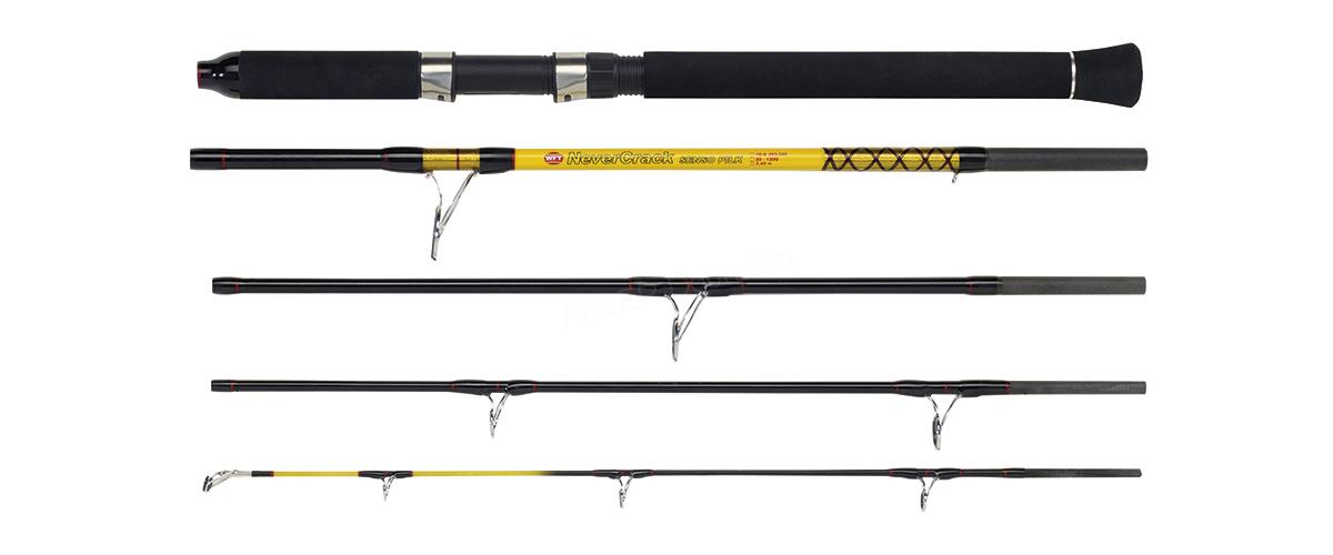 Rybářský prut do Norska, na sumce a universální rybolov NEVER CRACK Big fish nyní i 5ti dílném provedení. Pruty jsou osazeny titanovými očky SIC, pohodlným šroubovacím držákem na rukojeti a blank ošetřen epoxidovým lakem.